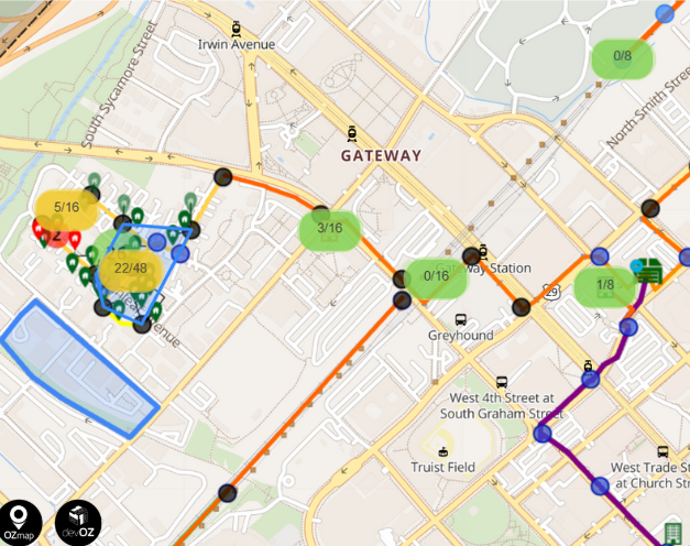 As you zoom in on the map, the capacity numbers cluster according to the location of the boxes. By hovering over a number, you can see the area that this capacity covers. In the image below, you can see several numbers spread across the map: the orange color indicates that the box has reached its maximum capacity, while the green color indicates that there are many boxes with available client splitters.