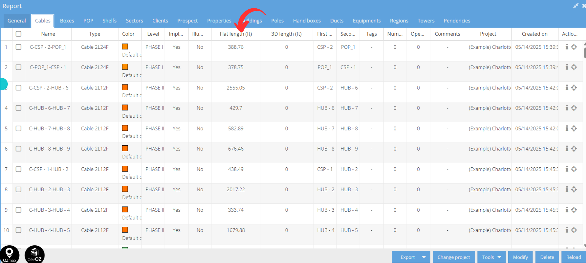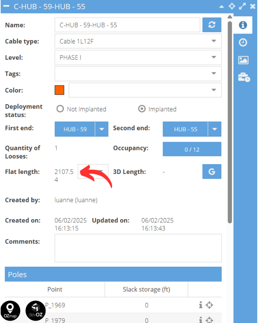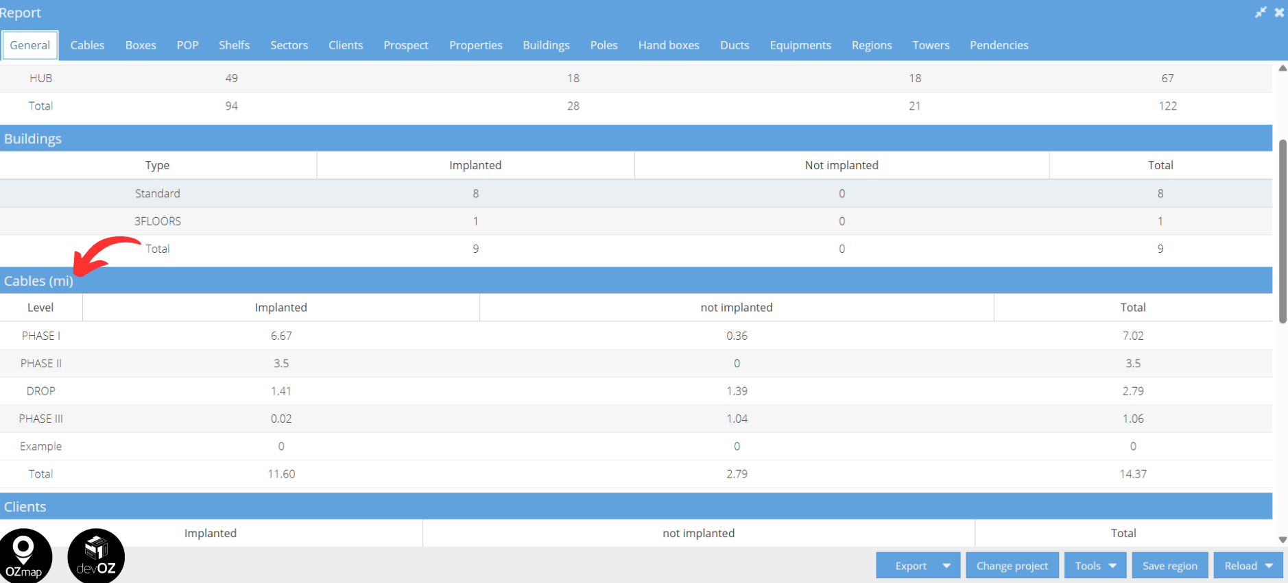 Now, if you want to view the total cable length used across the entire network, go to the “General” tab of the area report, under the “Cables” section. There, you can see the total length (in km), as well as the length of implanted and not implanted cables.