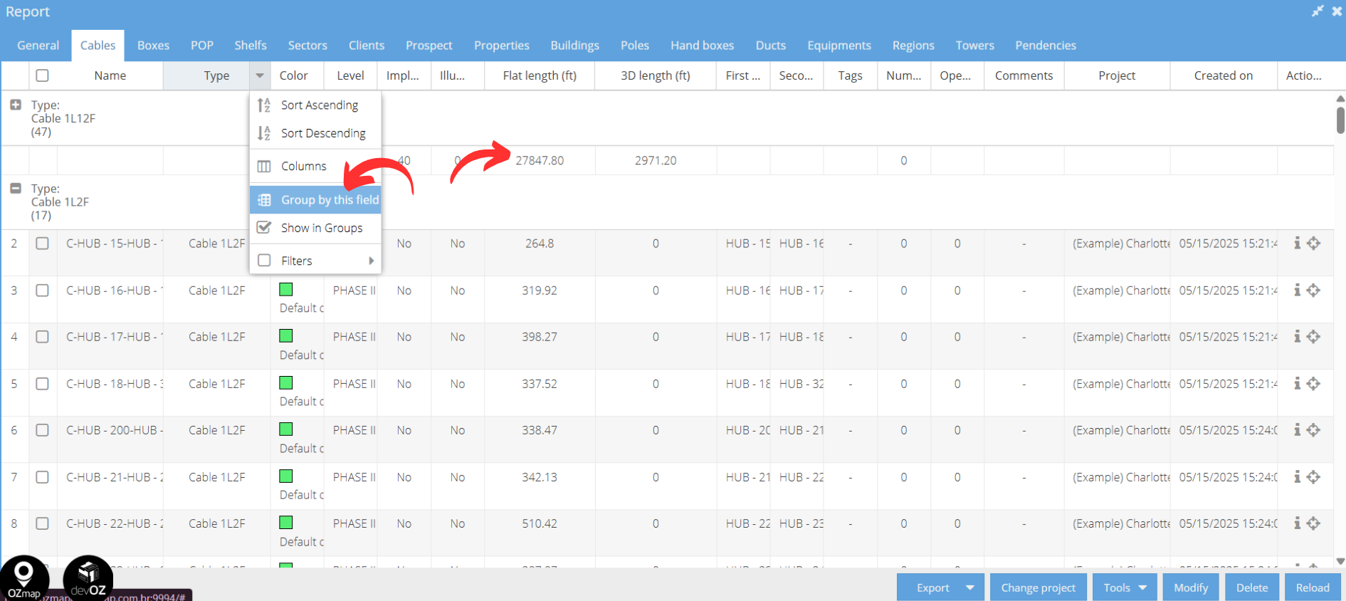 Another way to view this information is by grouping your cables by type. To do this, click on “Type”, then select “Group by this field”. Your cables will then be grouped by type, allowing you to see the quantity of cables in each group.
