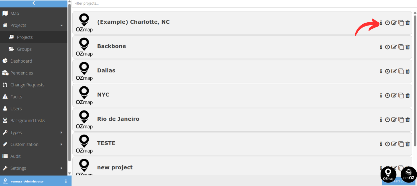 Another way to view this information is in the “Projects” window. Click the information icon on the right side of the screen, next to the project name: