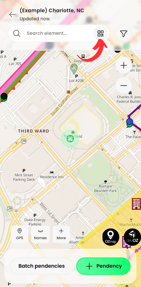For the technician to scan the QR Code, they must click the icon located next to the search bar in OZmob, as shown below: