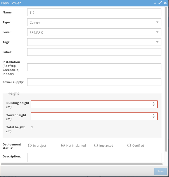 When you click on the button, a window will open where you can fill in all the information about the tower. In addition to the name, type, and level, it is also mandatory to fill in the height information in the 'Building height' and 'Tower height' fields. The other fields, such as Tags, Label, etc., are optional.