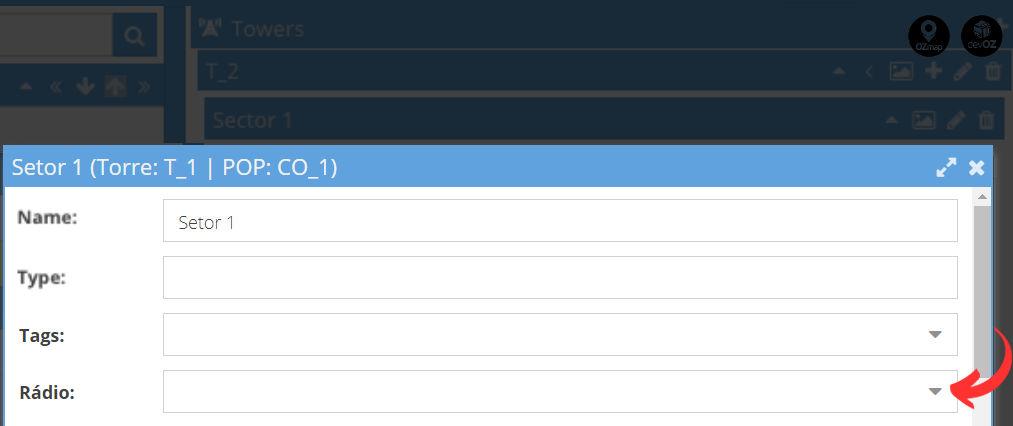 Once created, you can insert it into the tower sector by clicking on the edit button (pencil icon) highlighted in the image and selecting the desired radio.