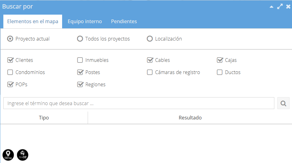 En el menú vertical, no hay ningún botón para acceder a la herramienta de búsqueda (también se puede acceder mediante Ctrl + F ). Te ayudará a ubicar elementos, ya sean clientes, inmuebles, ubicación, cables, cajas, condominios, postes, puntos de venta o incluso regiones.