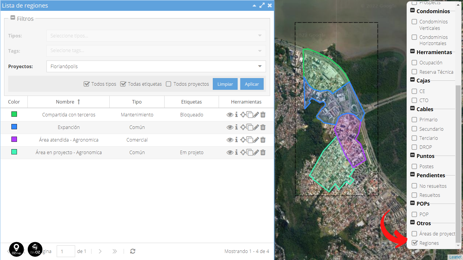 Las regiones son una función de OZmap que le permite categorizar su proyecto con una delimitación visual de áreas personalizadas en el sistema. Básicamente son polígonos delimitados en el mapa con diferentes colores, y es posible asociar esta distinción a características específicas o utilizando tipos estándar del sistema, como veremos a continuación.