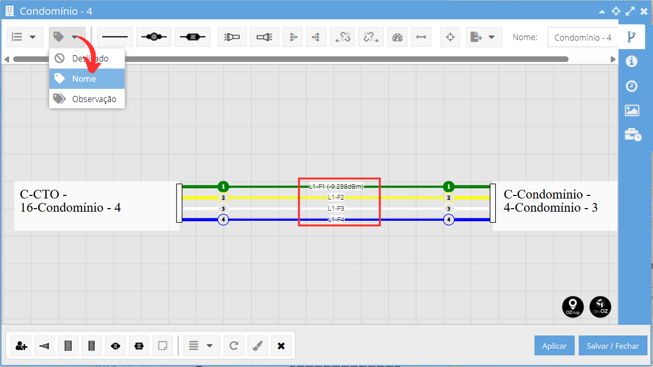 Selecionando a opção "Nome", os nomes de cada fibra ficarão visíveis. Há a possibilidade de deslocamento desse nome, caso deseje destacar alguma fibra em específico.