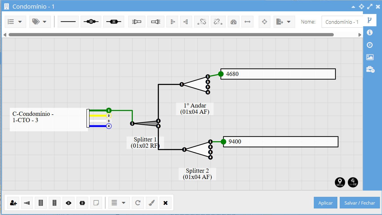 Abaixo criei um exemplo bem simples, apenas para fins de demonstração com a sequência POP > CE > CTO > Condomínio. Tudo conectado com um cabo de 1L6F (1 loose com 6 fibras).