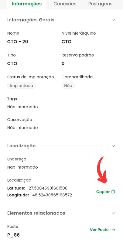 Rolar a página até as informações de Localização e terá a opção de copiar as coordenadas: