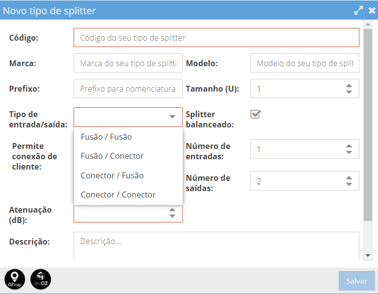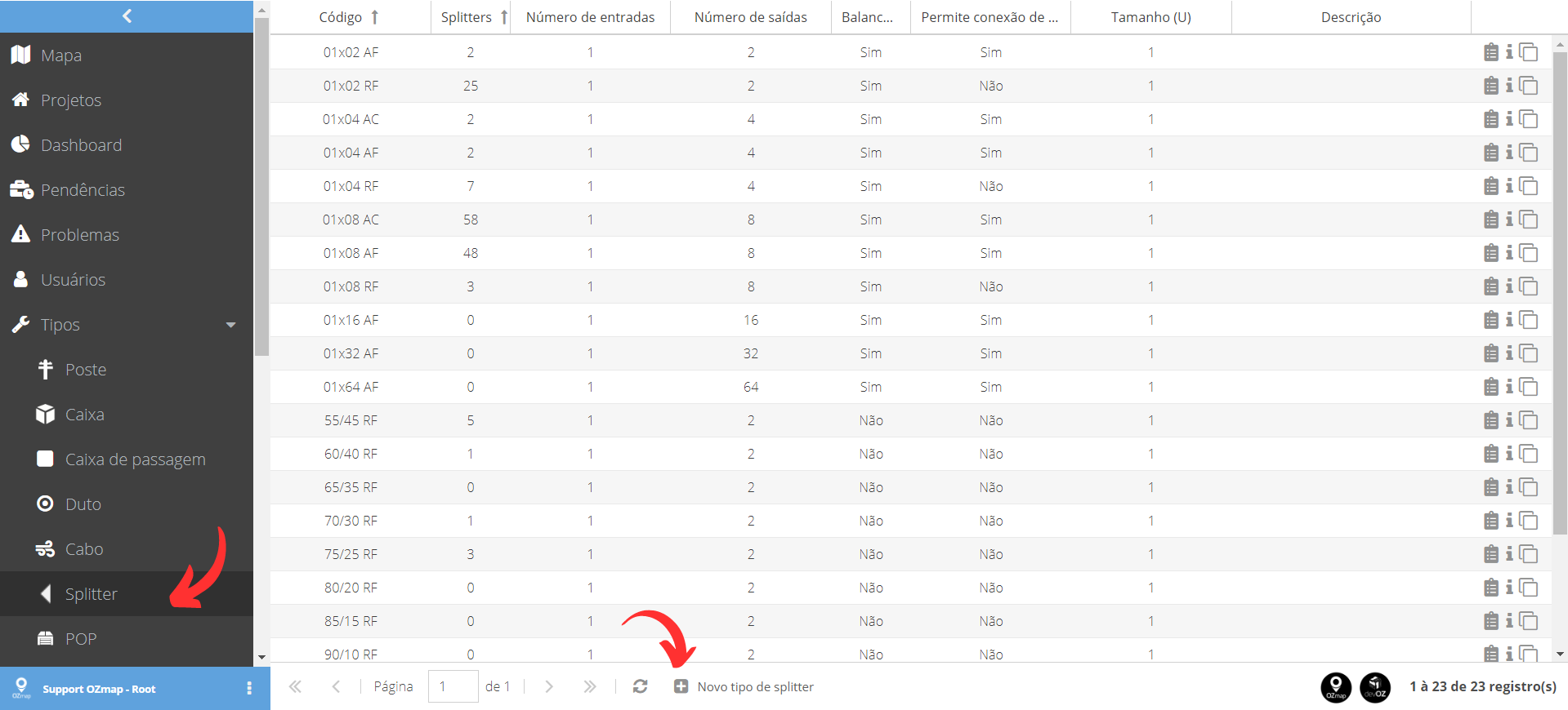 No OZmap, temos diversos tipos de splitters que podem ser personalizados de acordo com os equipamentos utilizados na sua rede. Dentro da aba de “Tipos de Splitter” você encontrará diversos tipos de splitters já cadastrados, e também poderá adicionar um novo tipo clicando no botão “Novo tipo de splitter”.