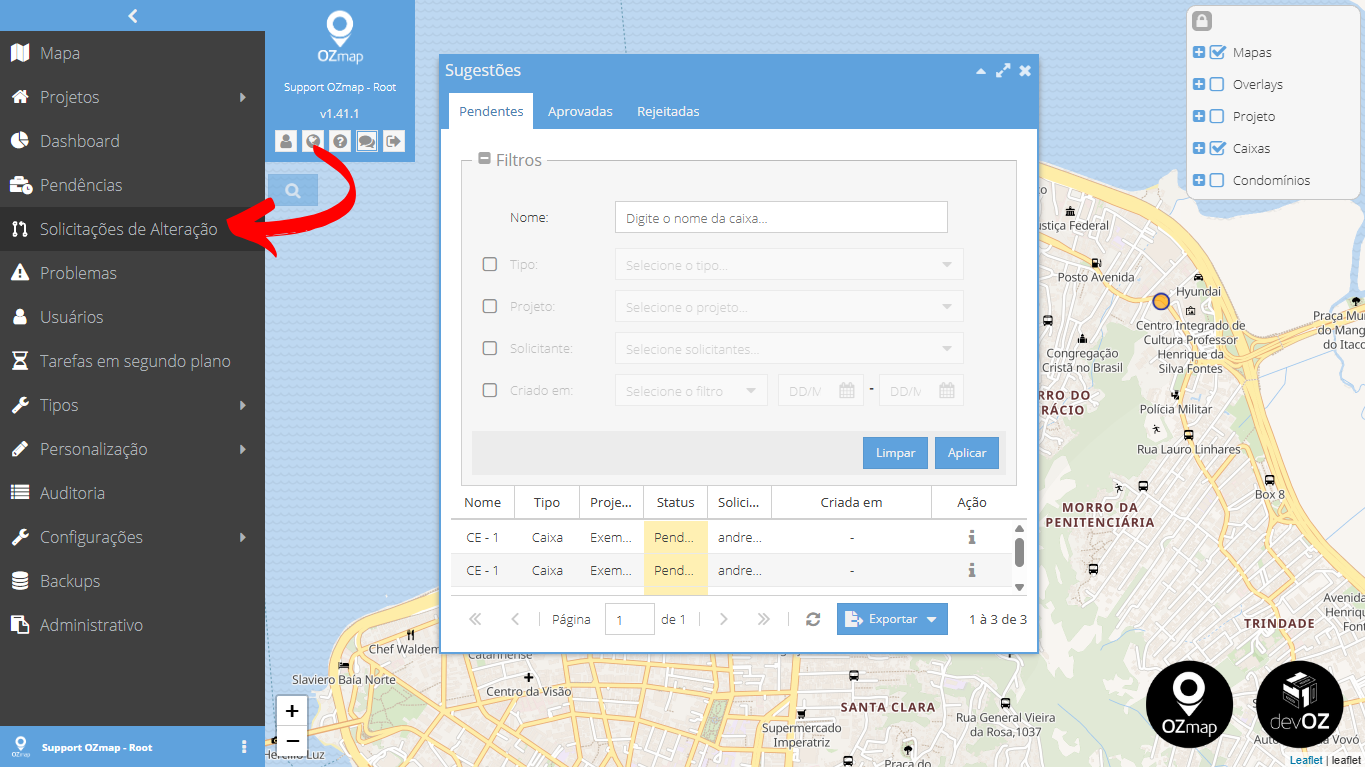 Nela, o mapa será mostrado apenas com as caixas/condomínios verticais em que uma alteração foi solicitada. Além disso, se apresentará automaticamente uma janela com informaçoes sobre as solicitações, onde é possível realizar diversos filtros. Assim como no OZmob, a janela é divida em solicitações pendentes, aprovadas e rejeitadas:
