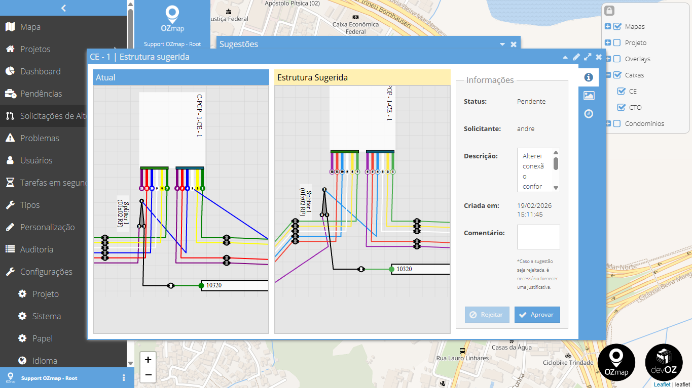 Com este módulo ativo, o sistema passa a oferecer funcionalidades integradas entre o OZmap e o OZmob. Os usuários do OZmob podem solicitar, diretamente em campo pelo aplicativo, alterações em conexões de caixas e em condomínios verticais. No escritório, os usuários do OZmap recebem essas solicitações para análise, podendo aprová-las ou recusá-las.