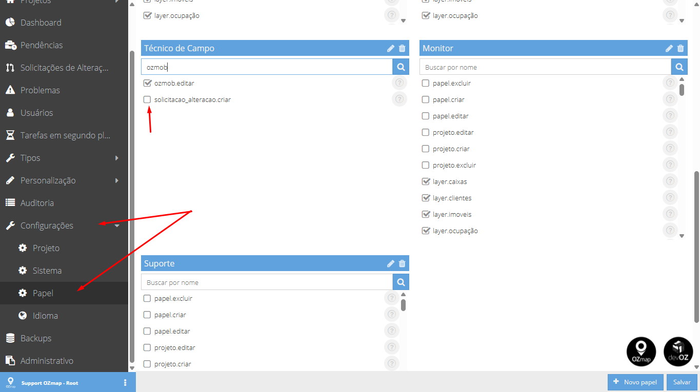 Para que os técnicos em campo tenham acesso à funcionalidade, é importante que ela esteja habilitada nas configurações de papel. Para isso, vá em Configurações > Papel, e pesquise por "OZmob". Habilite a permissão 'solicitacao_alteracao.criar' e clique em Salvar.